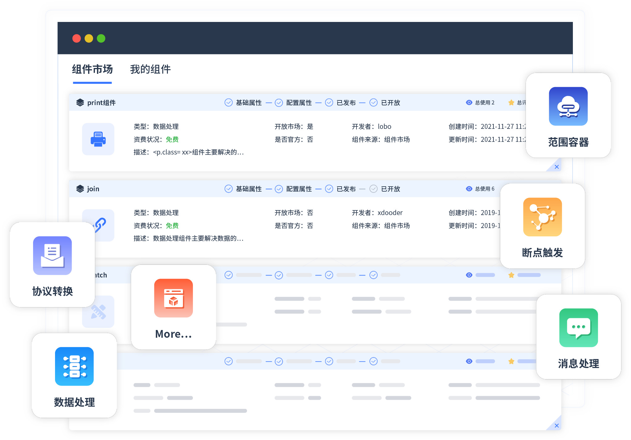 针对集成场景,,华为钱包提供组件市场,,,,例如协议转换、、、、消息处理、、、文件操作等。。。除平台提供的组件外,,,客户可以自定义所需组件。。。。