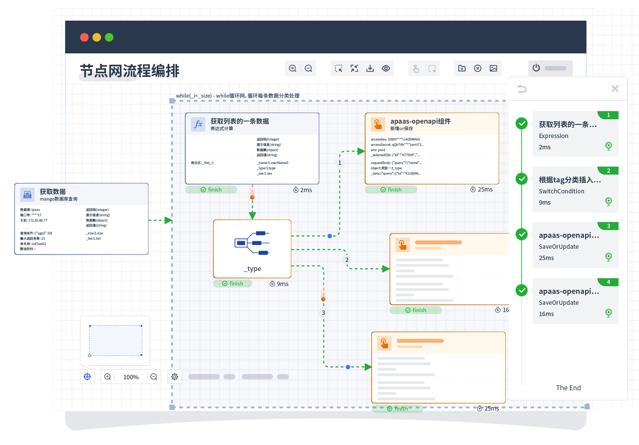 针对集成场景,,,,组件定义后支持进行流程编制,,,,不同于传统代码方式,,通过图形化展示,,支持在线调试、、日志查看和运行回放。。