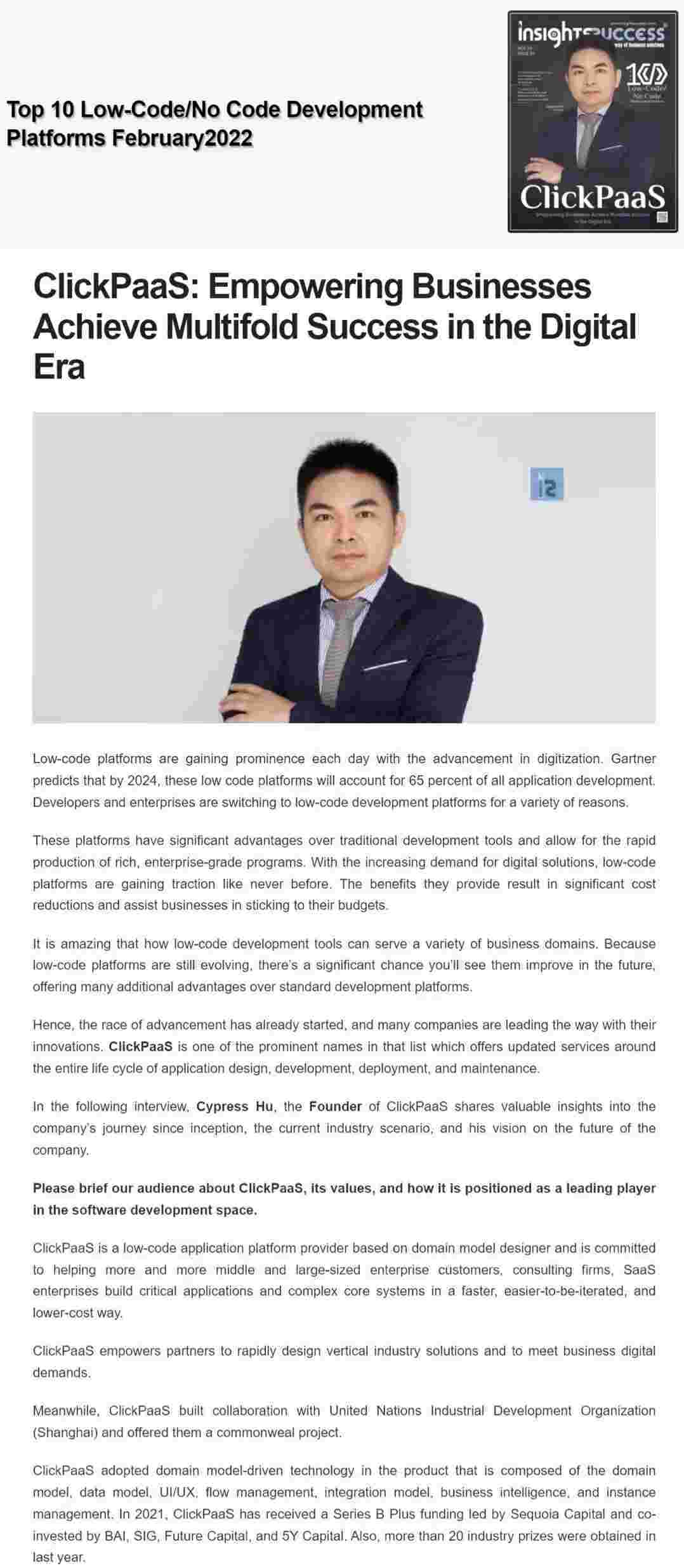 2022年年初,,,,华为钱包入选外媒Insights Success低代码/无代码开发平台 Top10,,创始人、、、、CEO胡柏受邀接受专访并荣登封面人物,,,,他与Insights Success的读者分享了华为钱包成立的初心、、、发展历程、、当前的行业发展趋势以及他对公司未来的展望。。