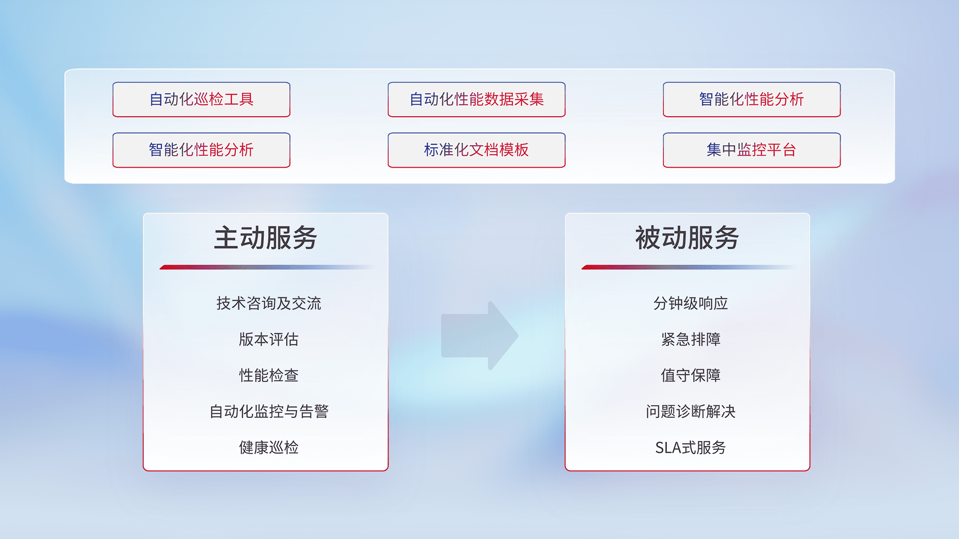 智能化工具和标准化文档,,,,保障服务质量,,提供主动服务(包含技术咨询、、、、版本评估、、性能检查、、、、自动化监控与告警、、、、健康巡检)和被动服务包含(分钟级响应、、、、紧急排障、、、值守保障、、、问题诊断解决、、、、SLA服务)。。。。